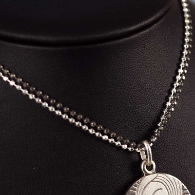 Medalla de plata de Ley, de 20mm con la imagen de la Virgen María rezando. De diseño propio de Luminaria, moderna, original y de calidad máxima.