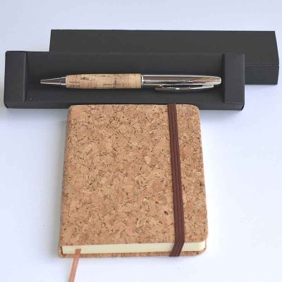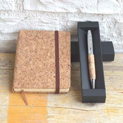 Libreta tamaño A6 con tapas de corcho natural, y cierre de banda elástica.