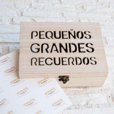 Precioso Cofre de madera tratado en decapado blanco, y con el mensaje troquelado en la tapa «Pequeños Grandes Recuerdos».