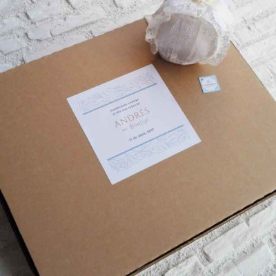 Personalizamos tu regalo, envolviéndolo en papel de seda y empaquetándolo en una caja kraft para su envío, con una etiqueta personalizada en colores con el nombre del bebé y la fecha opcional si se desea del Bautizo.