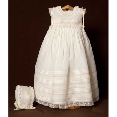Elegante Vestido Ceremonia o fiesta, confeccionado en tela de batista con entredos suizo y valencien de algodón. Capota a juego