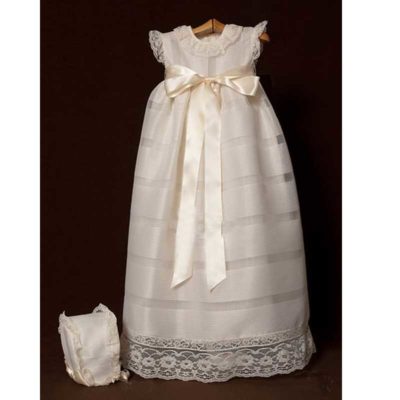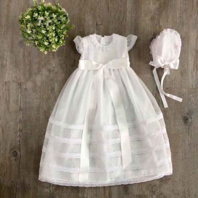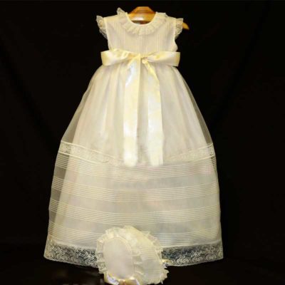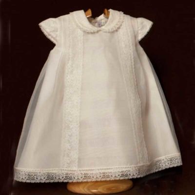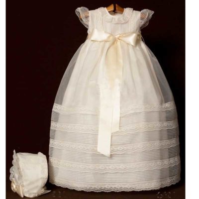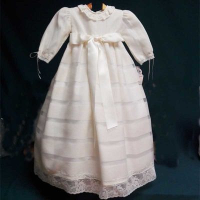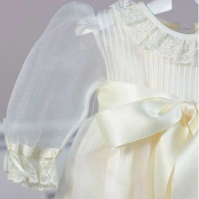 Precioso Vestido de Ceremonia o Bautizo Isabel, confeccionado en seda natural yentredos suizo y puntillas valencien de algodón.