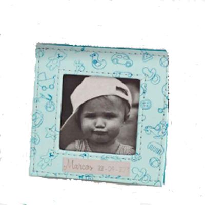 Vistoso Marco Plateado de Bautizo, decorado con motivos de Bebé en relieve y con posibilidad de marcaje de nombre del Bebé y fecha de nacimiento o de la ceremonia del Bautismo.