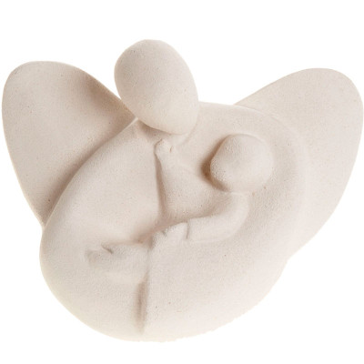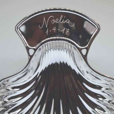En una de las alas podemos leer la inscripción Ha llegado un ángel (con 4 estrellitas) y en la otra ala grabamos el nombre del bebé y la fecha que nos indiques de nacimiento o del bautizo.