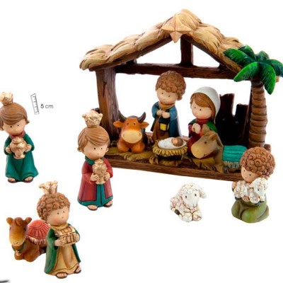Sencillo Belén infantil, confeccionado en madera barnizada, con 15 figuras, portal, palmeras, pastores, ovejas y Reyes Magos incluidos. Muy apropiado para que puedan jugar los más peques de la casa. Este Belén no es sólo para decorar vuestra casa es ideal para enseñar a los niños la historia de la Navidad de manera divertida. Todas las figuritas son de madera maciza y pintadas en bonitos y llamativos colores. Con las palmeras cercando la escena, este Belén da un bonito ambiente infantil navideño.