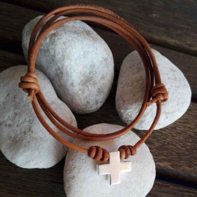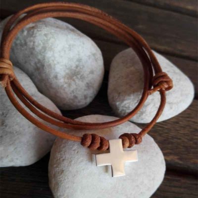 - Moderna Pulsera de chico, con cruz de plata maciza, de ley, montada sobre cuero marrón ajustable con nudos correderos, para llevar a diario. Se entrega en estuche de regalo.