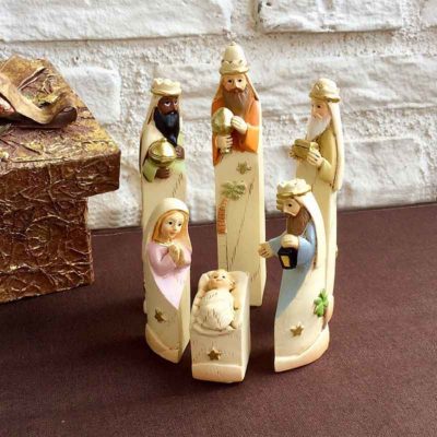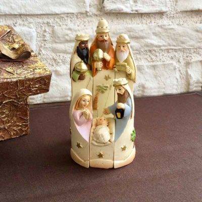 Figuras talladas en madera y Teñido con al menos 3 tonos de color y tratado con pinturas pastel y cera oro.