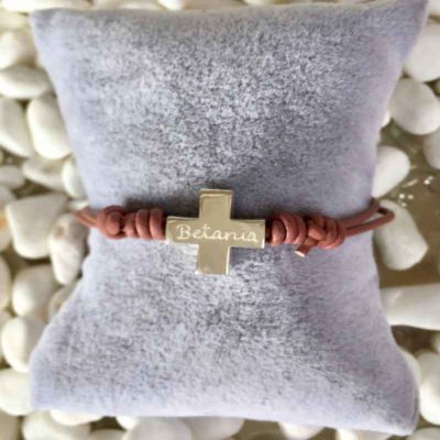 - Pulsera Cruz de plata de Ley, montada sobre cuero azul marino ( o marrón si no tuviéramos) y ajustable a la muñeca con nudos correderos. También podemos grabarla si el nombre del niño no es muy largo.