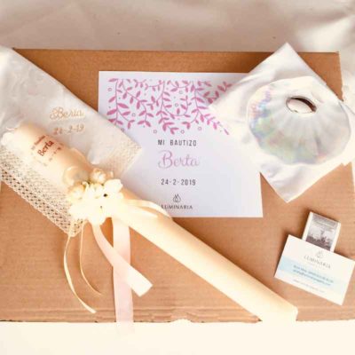 - Cirio o Vela de Bautismo opcional, lo personalizamos grabando el nombre y la fecha del bautizo y adornamos con un lazo de seda.
