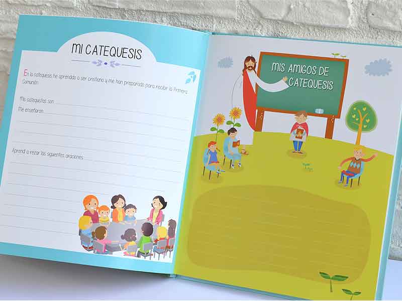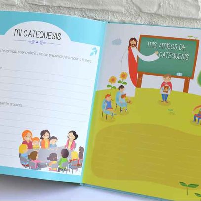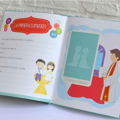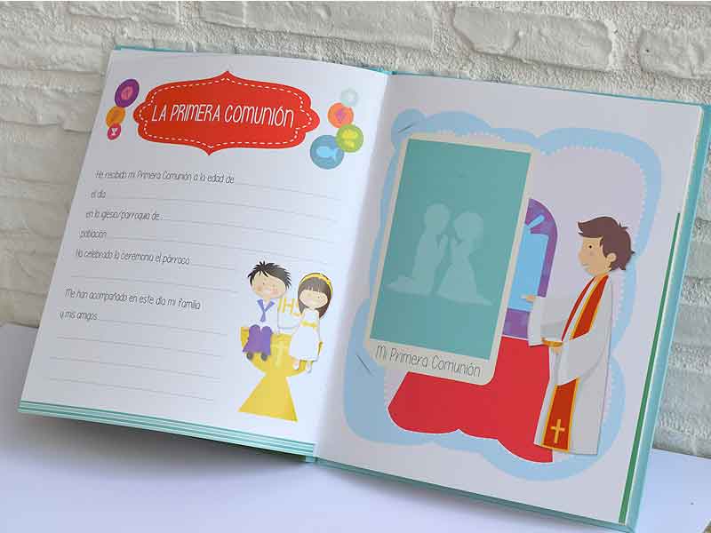 Es un álbum muy completo, con todas las páginas impresas, y espacios para poder rellenar con fotografías de la familia, amigos, compañeros de catequesis, todos los momentos importantes para recordar.