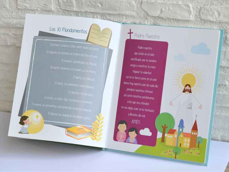 Lo completan unas páginas con oraciones, como el Padrenuestro, o Los Diez Mandamientos.