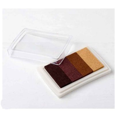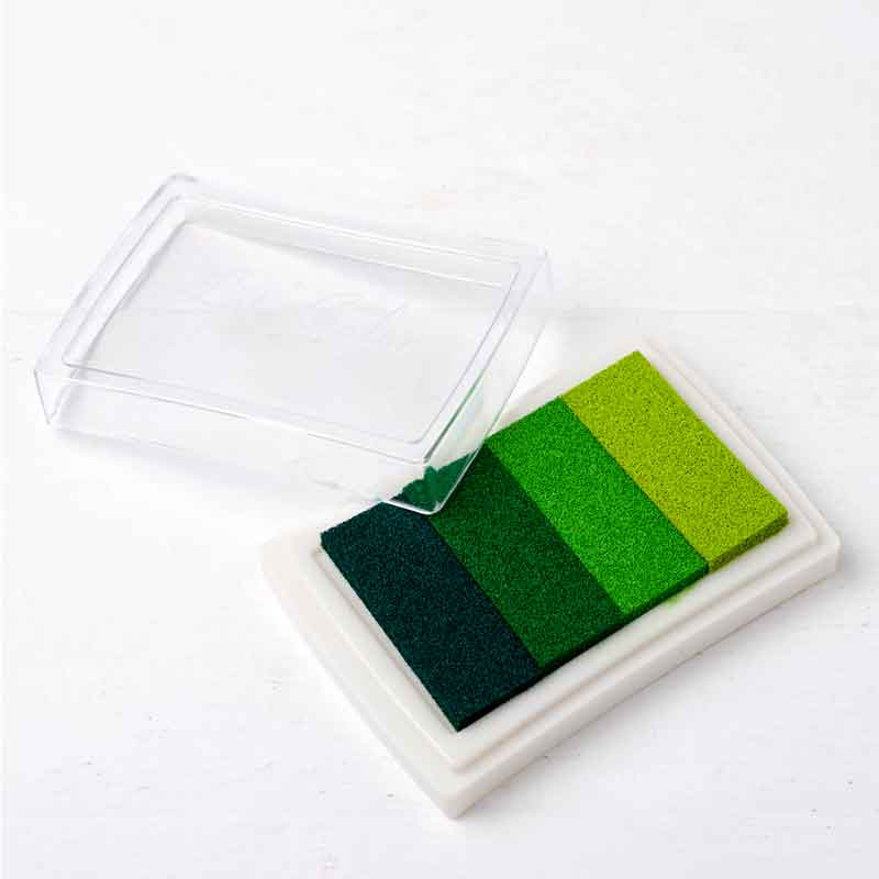 Enviamos dos cajitas de almohadillas de tinta, en color verde y marrón imitando los tonos del Árbol. Cada cajita con su tapa mide 7.5 x 5.2 cms y lleva cada una 4 subtonalidades en degradado.