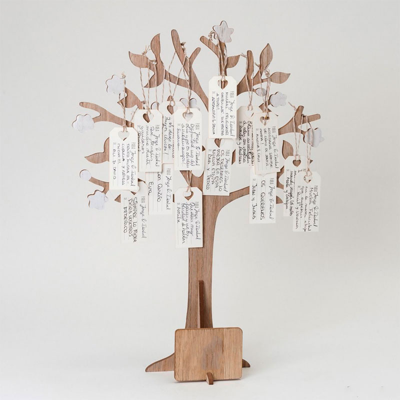 Sorprende a tus invitados o a los protagonistas de una Celebración con este «Árbol de los buenos deseos». Es un «Árbol-Joyero», confeccionado en madera clara con adorno de flores blancas también de madera, del que se deberán colgar tarjetas con cordel, dedicadas al protagonista de la celebración.