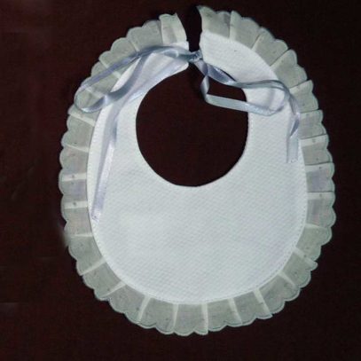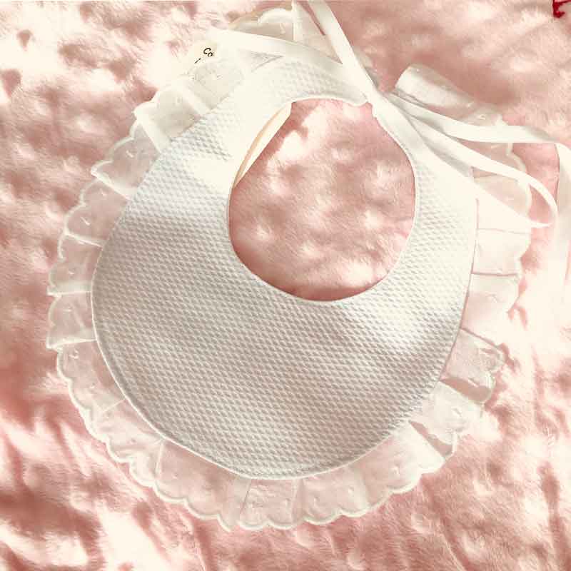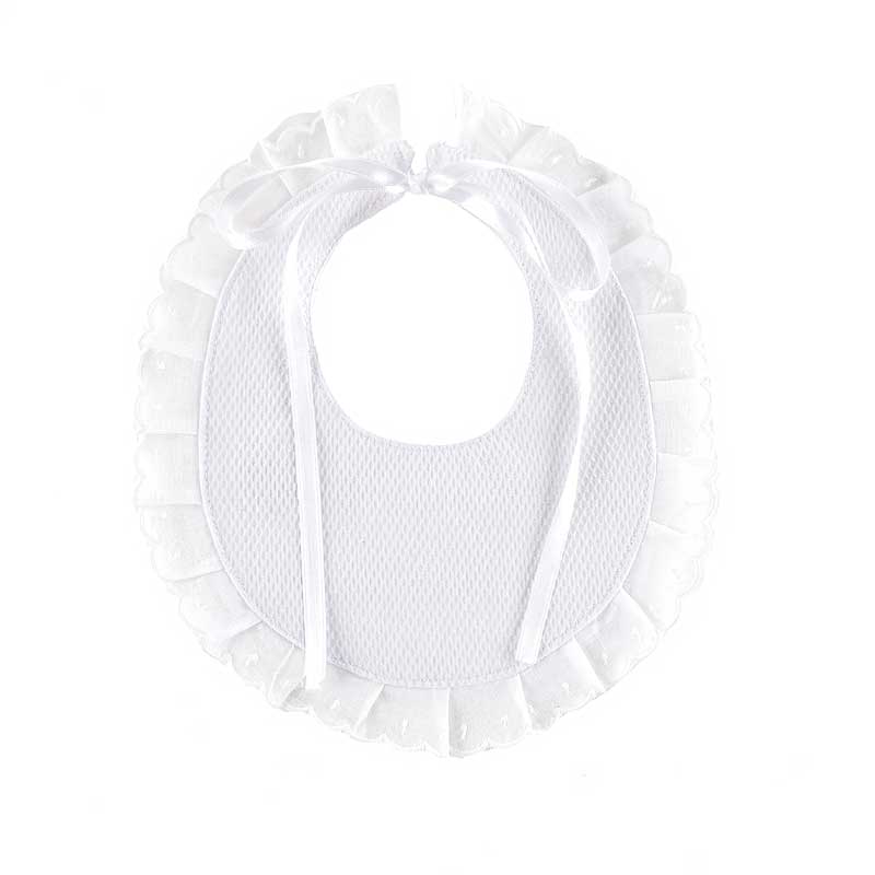 Elegante babero de bebé, confeccionado en tela de piqué blanca y rematado en plumeti.