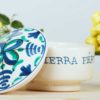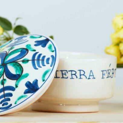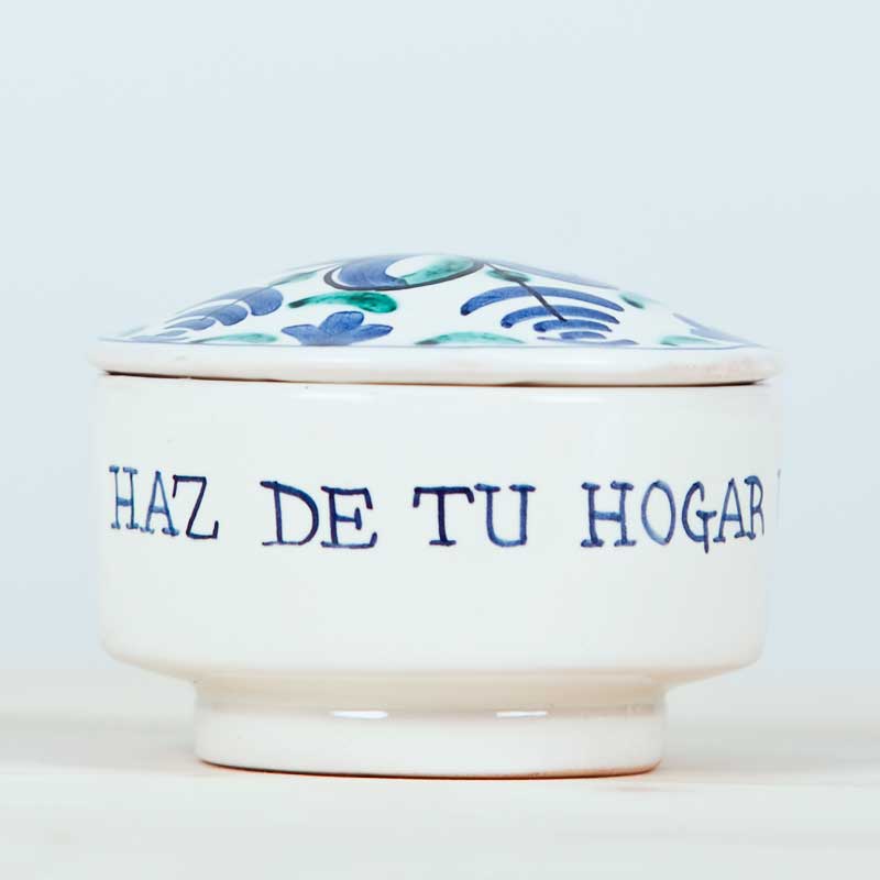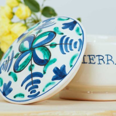 Cajita de Cerámica artesana, cocida, esmaltada y pintada a mano en azul y verde.