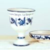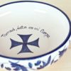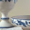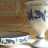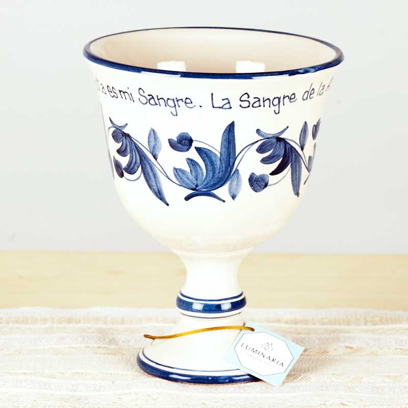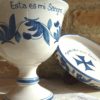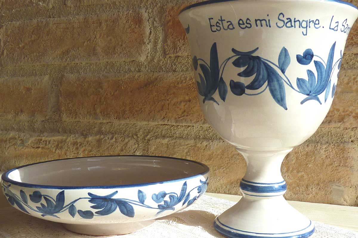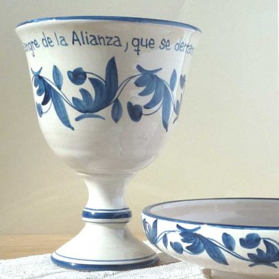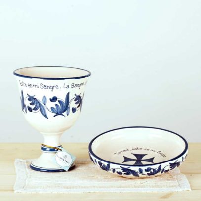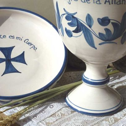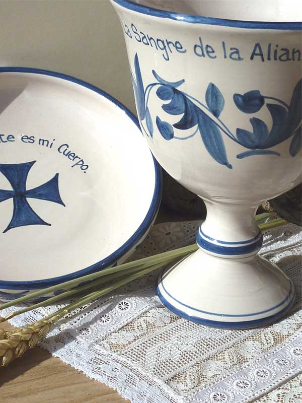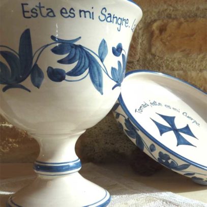 Conjunto de Cáliz y Patena, de cerámica artesanal,cocidos, esmaltados y pintados a mano en azul. Con texto del Evangelio escrito también uno a uno a mano.