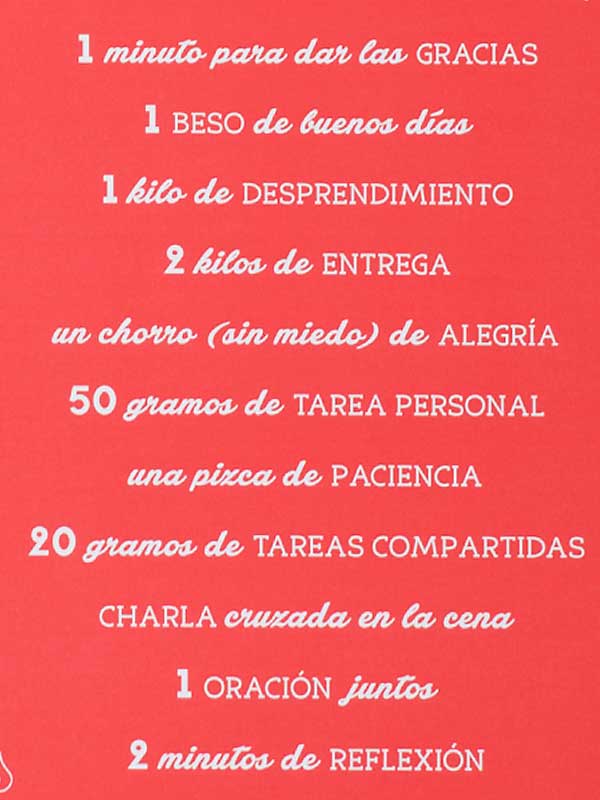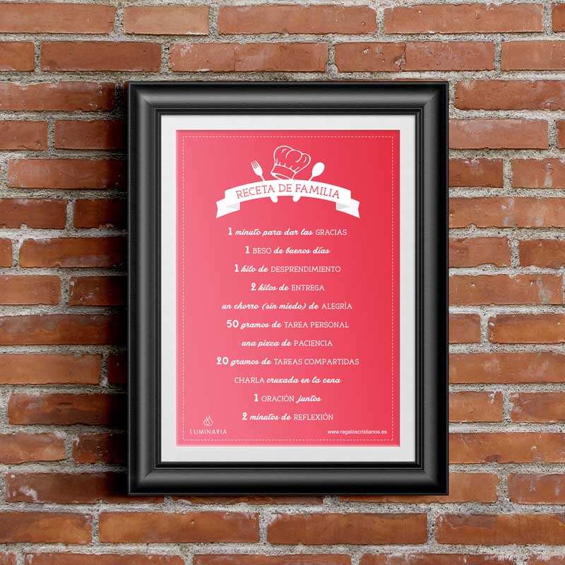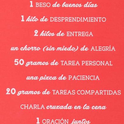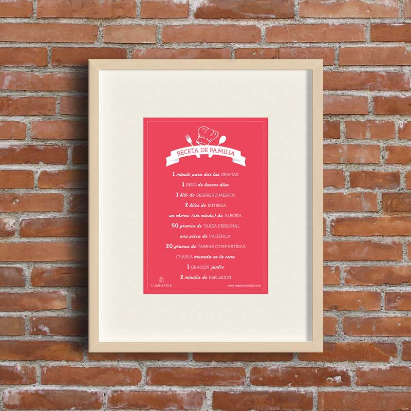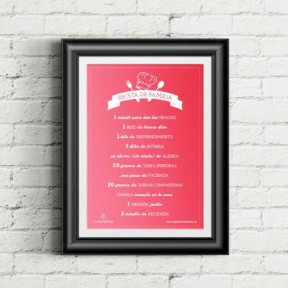 Y ¿qué me decís del cartel «Receta de Familia» en color rojo? Lo hemos hecho desde nuestra propia cocina de Luminaria, entre risas y discusiones, creando debate y polémica. ¿Os imagináis? Unos proponíamos ingredientes y otros nos tiraban de las orejas a los que no los cumplíamos. En fin… por lo menos, pongamos buenas intenciones y, luego, colgad vuestro cartel. ¿Podríais contarme que pasó? Os aseguro diversión.