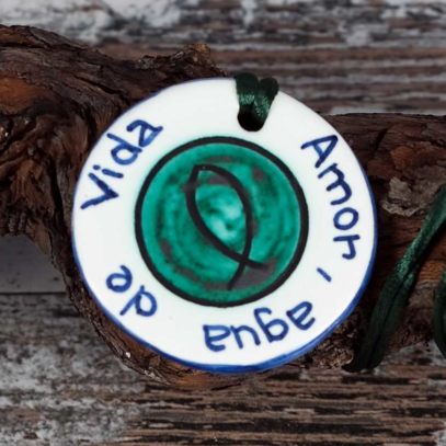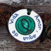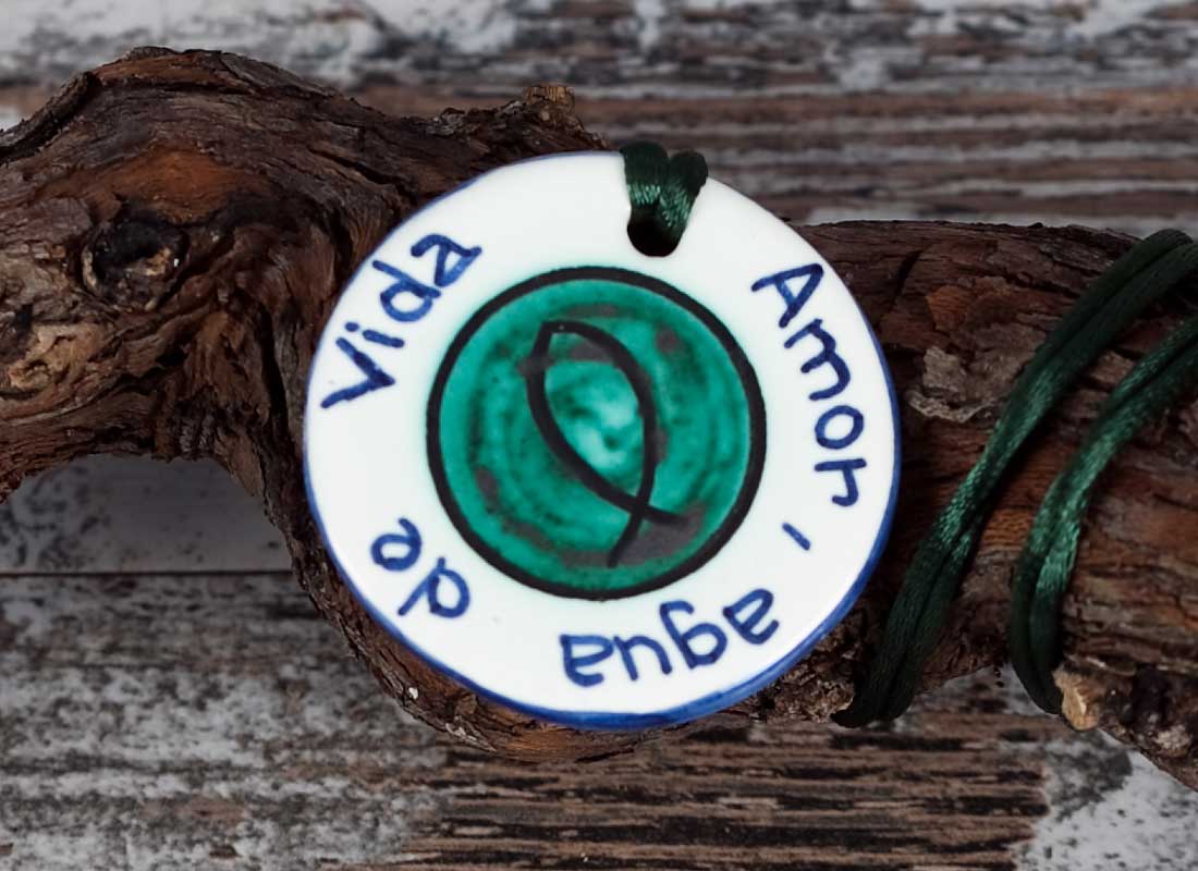 Colgante de cerámica artesana moldeado, cocido, esmaltado y pintado a mano en azul y verde y con texto de Luminaria.
