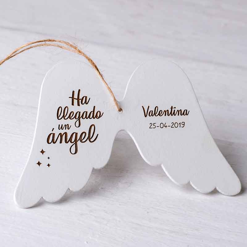 En una de las alas podemos leer la inscripción Ha llegado un ángel (con 4 estrellitas) y en la otra ala grabamos el nombre del bebé y la fecha que nos indiques de nacimiento o del bautizo.