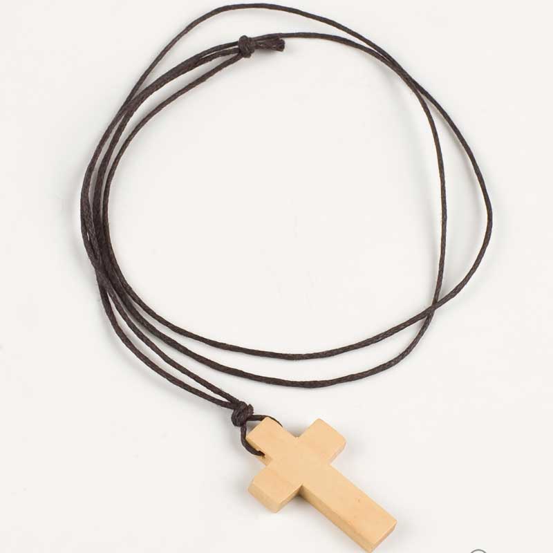 Sencilla y humilde Cruz de Madera con cordón marrón, que puede ser un bonito regalo o detalle, para guardar de recuerdo. Puede marcarse el nombre en una de las dos caras, o simplemente la fecha.