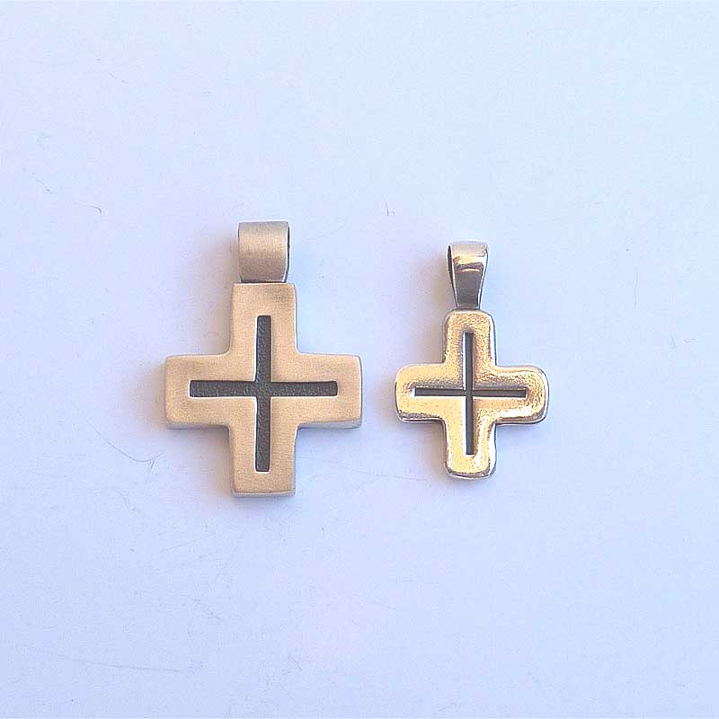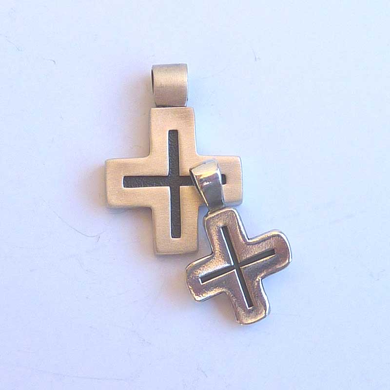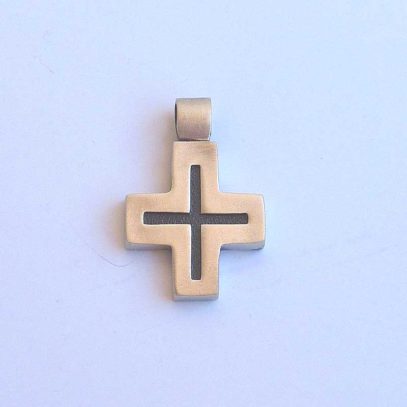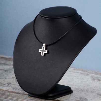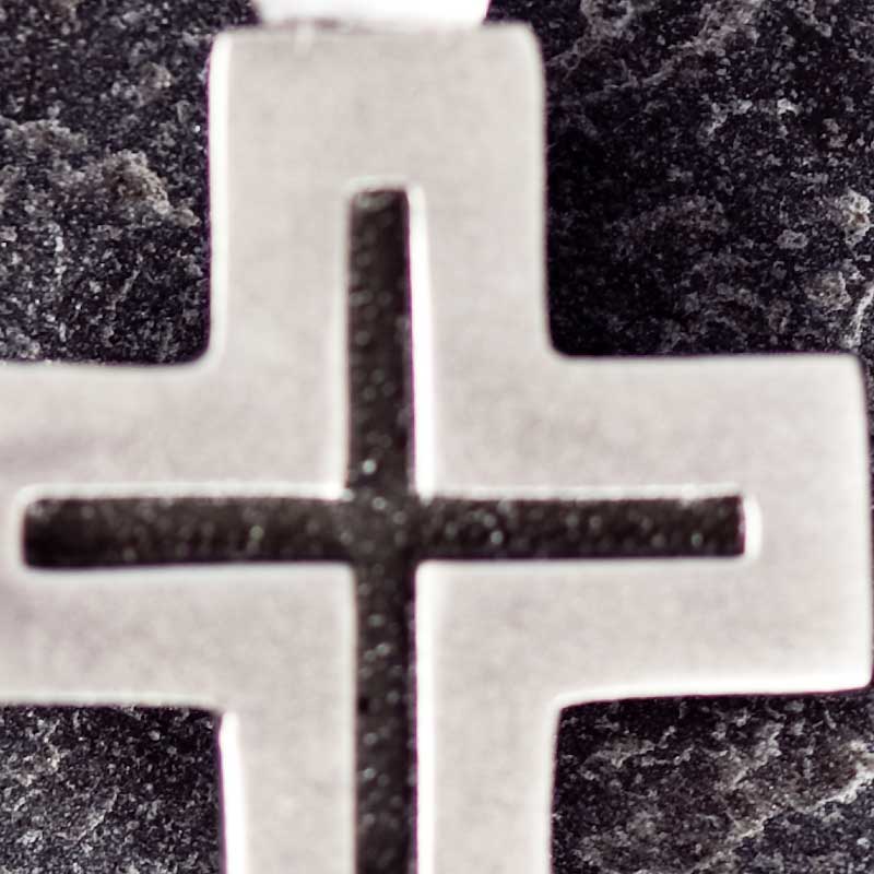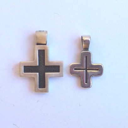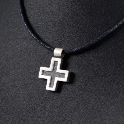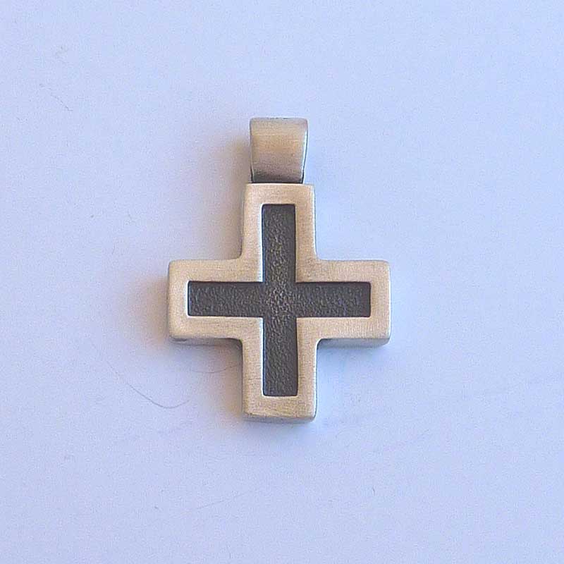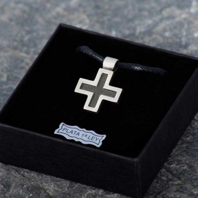 La cruz llamada griega es recogida, compacta, de concepción «circular»… Hoy su diseño resulta moderno y le confiere un aire especial. Sus acabados hacen que tenga un aire joven, fresco, de «estreno». Combinando el proceso de oxidado que ennegrece la plata con el acabado mate, hemos logrado sacar a este metal noble su lado masculino.