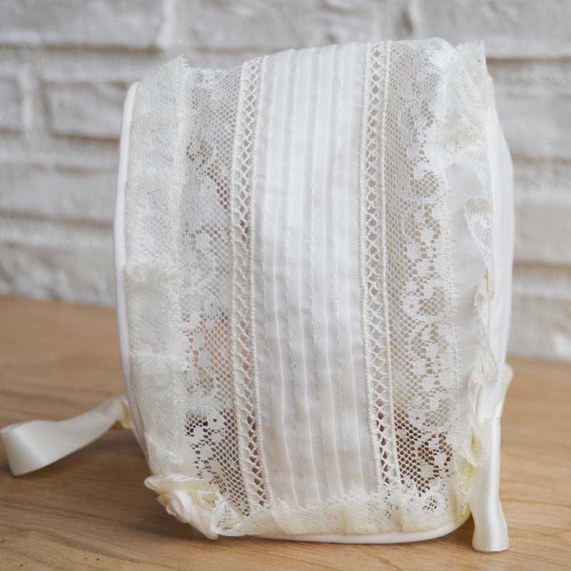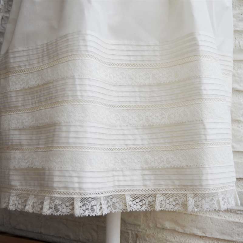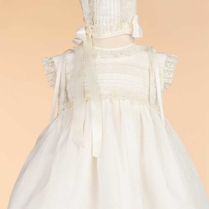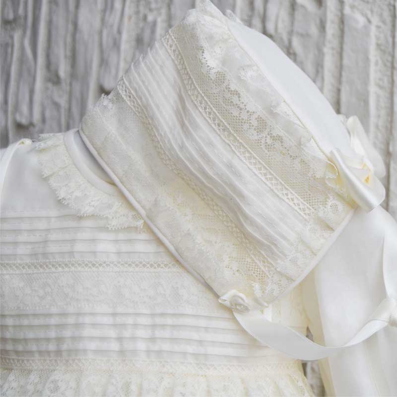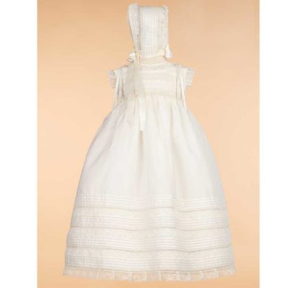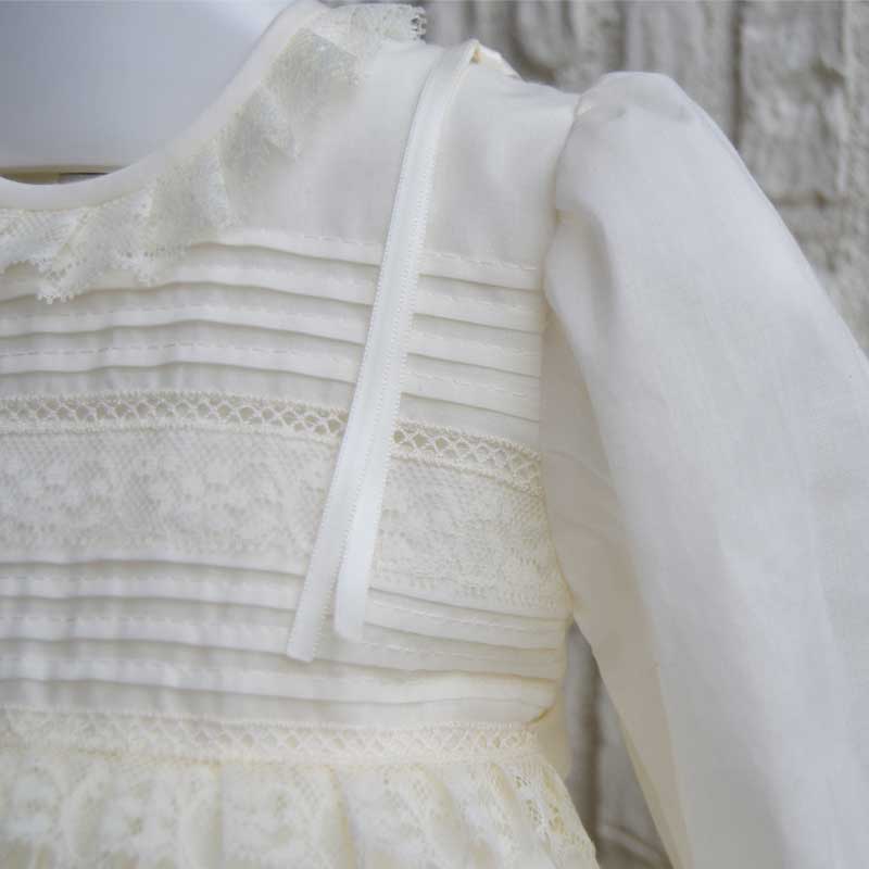Confeccionado en color crudo claro, de excelente calidad, en batista con encajes de valenciene , vainica y bolillo de algodón.