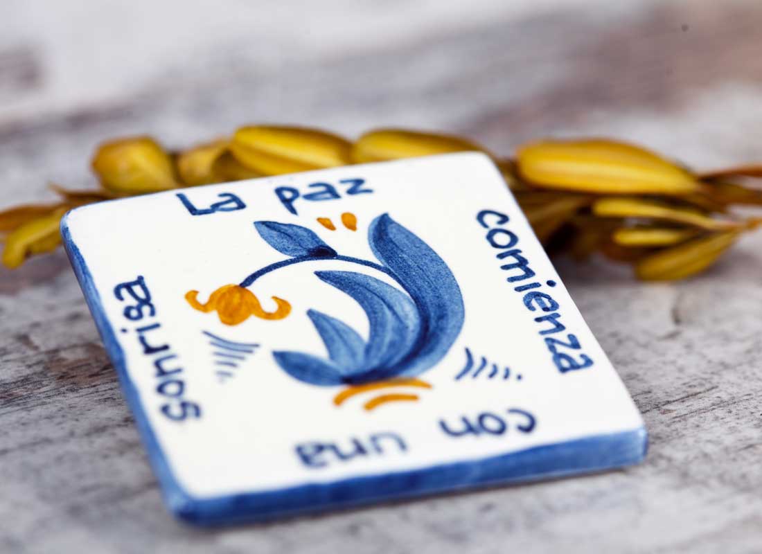 Texto: «La paz comienza con una sonrisa» (Madre Teresa)