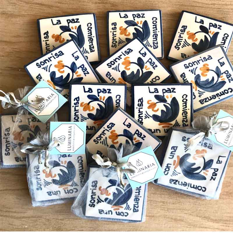 Imán cuadrado, de cerámica artesanal, moldeado, cocido, esmaltado y pintado a mano, en varios colores.