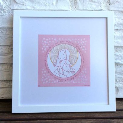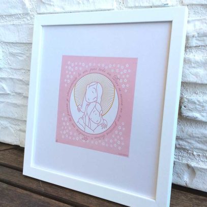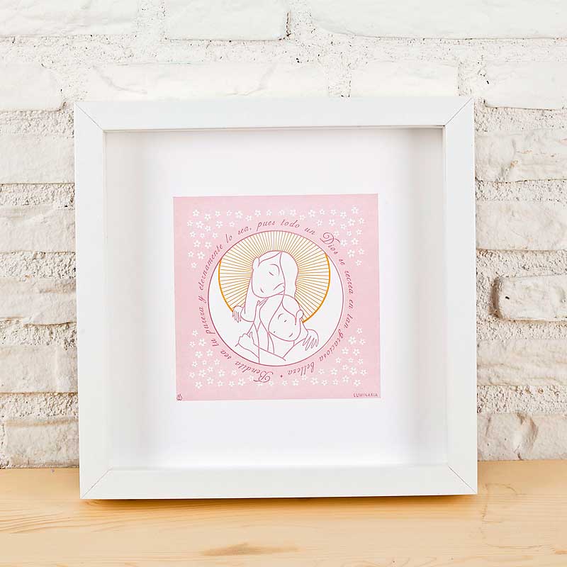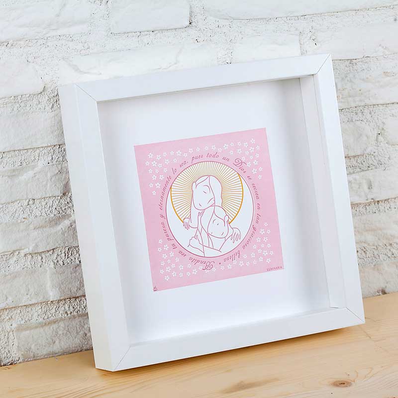 Este dibujo de La Virgen María cobijando a una Niña tiene líneas actuales y frescas, de gran expresividad. Transmite cariño y confianza. Así vemos también a la Virgen, como «amiga». Está diseñada en colores suaves rosas, que la hacen fácilmente entonable en cualquier habitación de niña. La vemos ideal para regalársela el día en que celebra su Primera Comunión. También por su cumpleaños o en cualquier otro momento como con motivo de la Navidad.