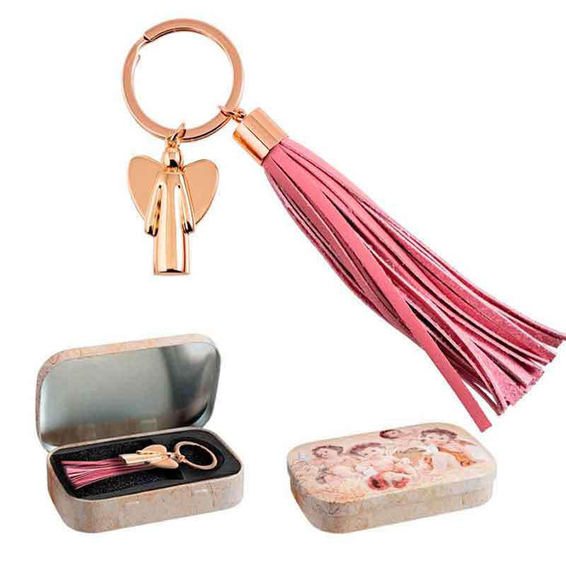Llavero Ángel con Borla Rosa, llavero de metal dorado y con una borla rosa de ante, perfecto para que lo regales a cualquier chica que se confirma, a su catequista, profesora o amiga religiosa.