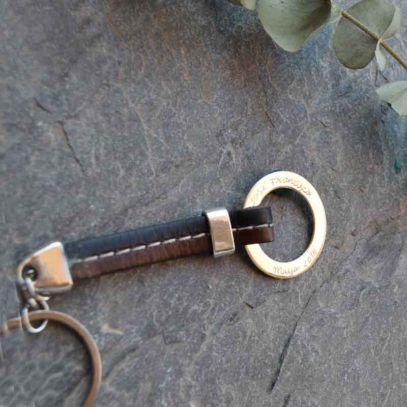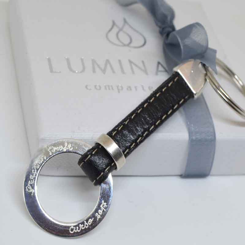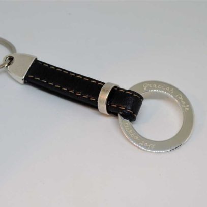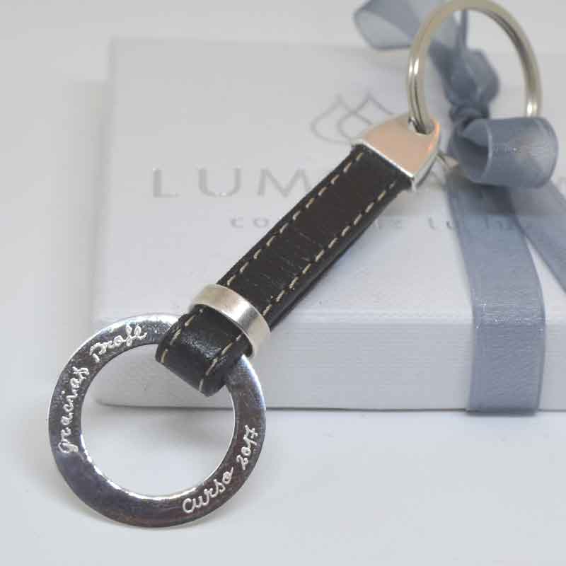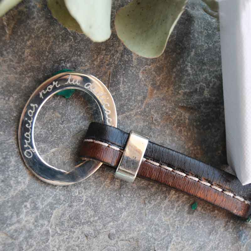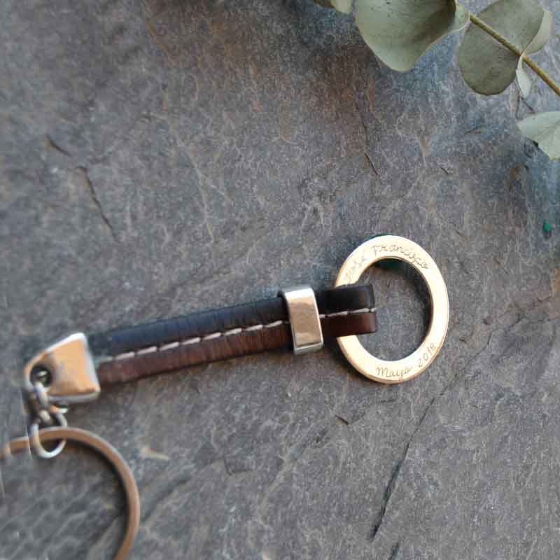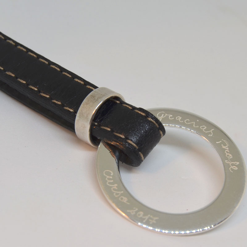 Este es un moderno Llavero con una pieza de Aro de plata de Ley de 30 mm grabada y montado sobre cuero pespunteado.