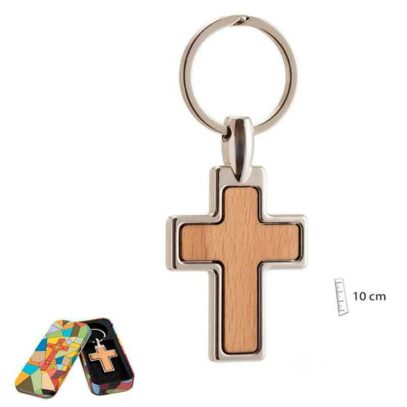 Llavero Cruz Madera, es un llavero muy bonito y elegante, con un acabado muy fino de la madera pulida y el brillo plateado del metal, de nuevo diseño.