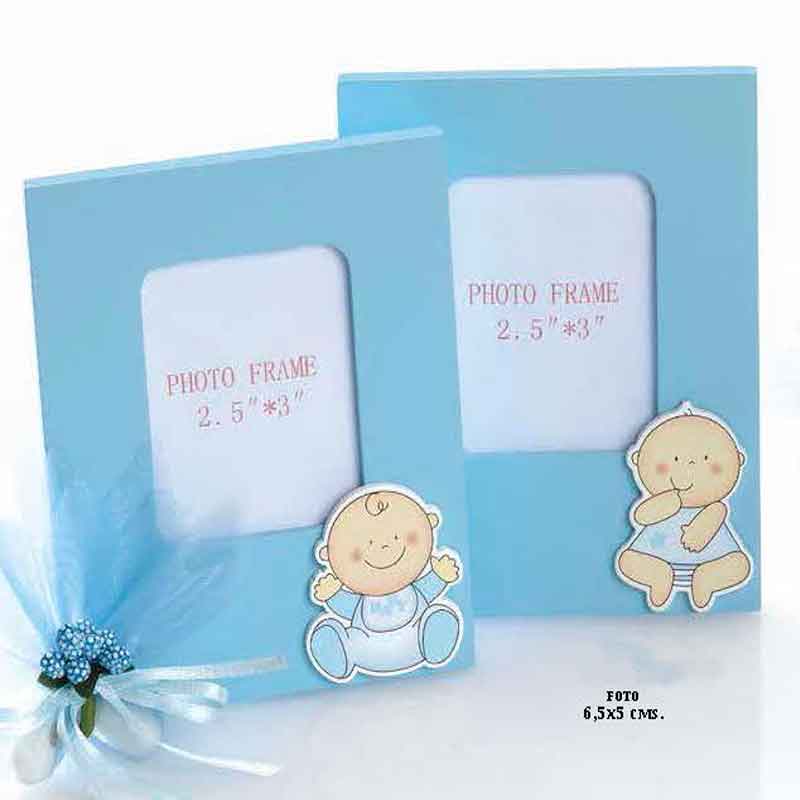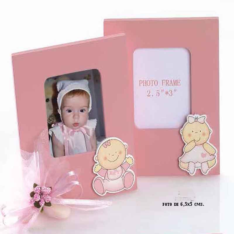 Bonito Marco de madera Bebé, para detalle de regalo de invitados de Bautizo, se entrega con los dos motivos surtidos. Puede personalizarse si se desea con adorno de peladillas y flor, o con una chapa metálica con la grabación del nombre del niño y la fecha del Bautizo.