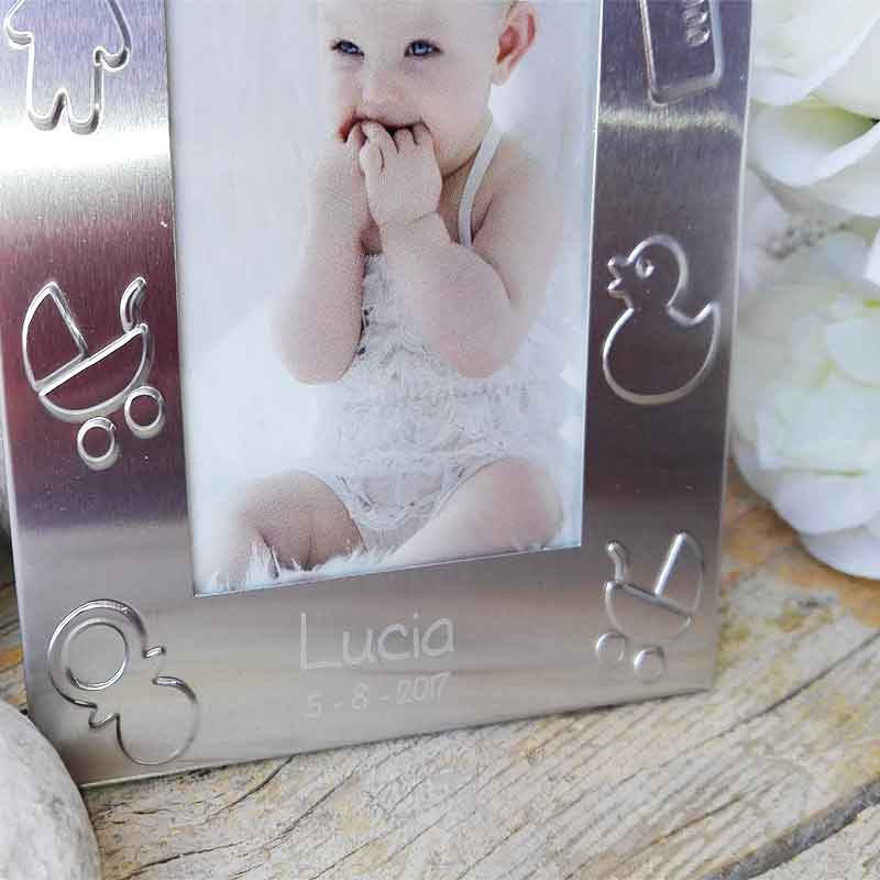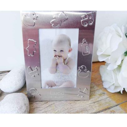 Vistoso Marco Plateado de Bautizo, para detalles de invitados está decorado con motivos de Bebé en relieve y con posibilidad de marcaje de nombre del Bebé y fecha de nacimiento o de la ceremonia del Bautismo.