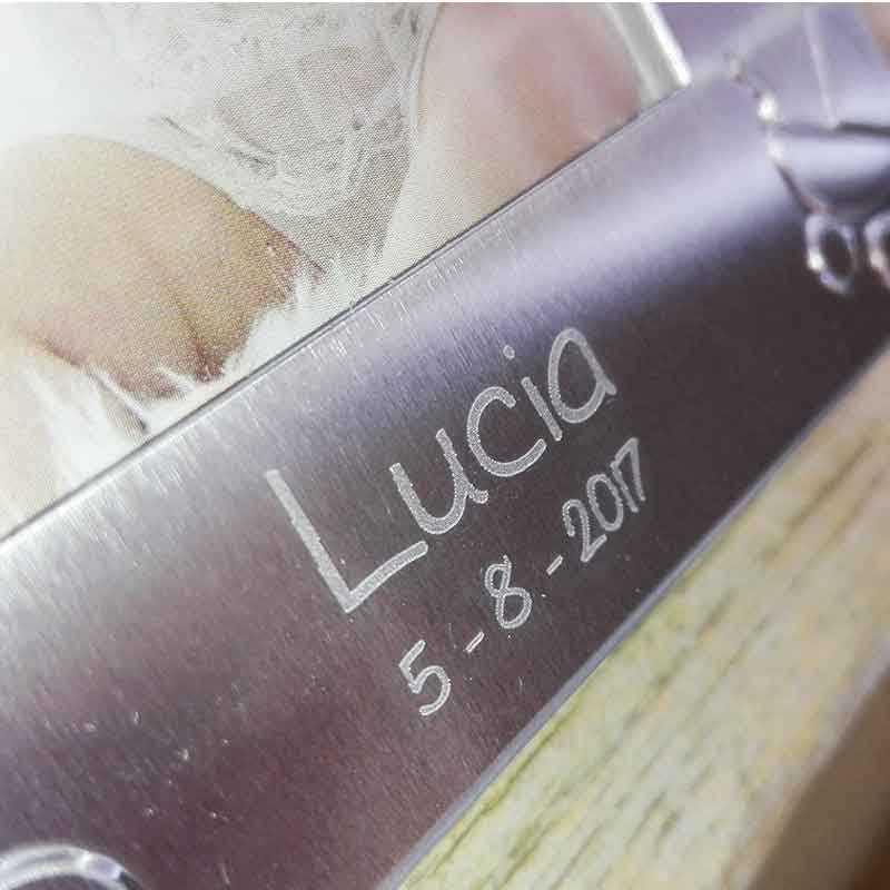 Un precioso y cuidado llavero con los datos de nacimiento grabados en el metal. Rematado con una fila línea de color en rosa o azul.