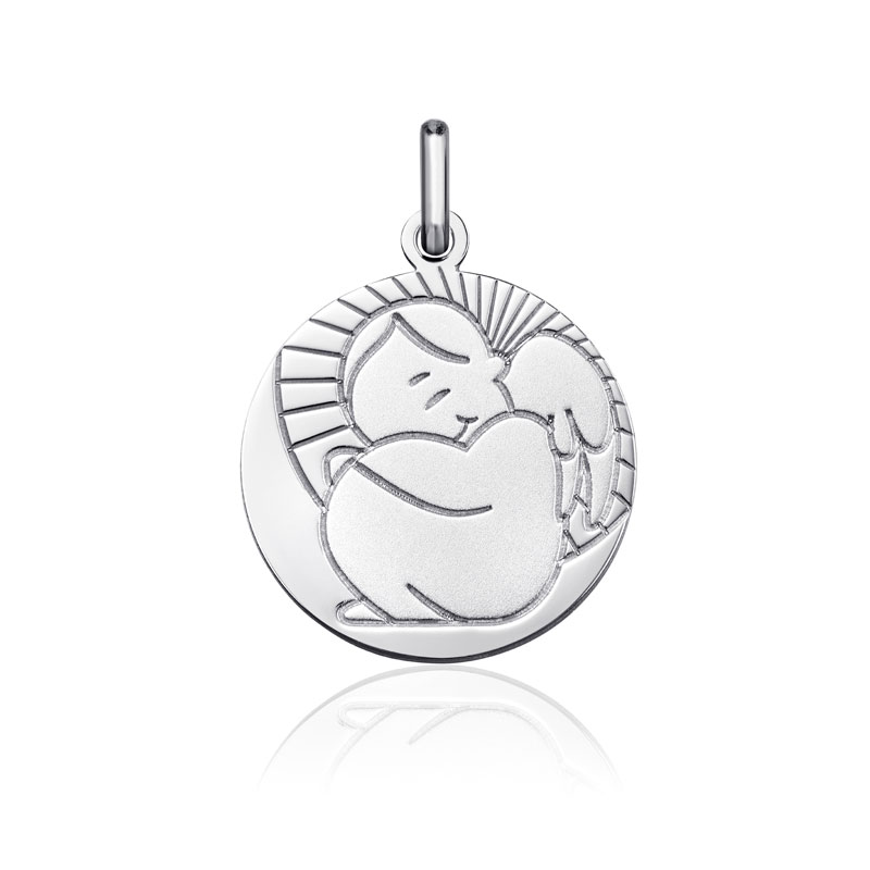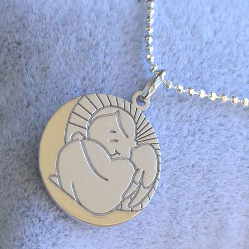 Medalla de plata «Angelito Escondido» confeccionada en plata de ley 925 , acabado en brillo y mate, con pulido espejo. Perteneciente a la colección de Luminaria «Angelitos de Luz».
