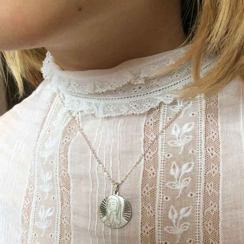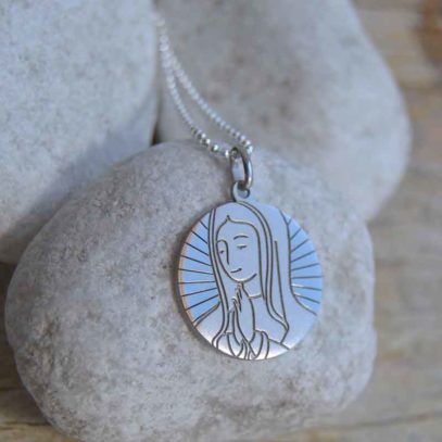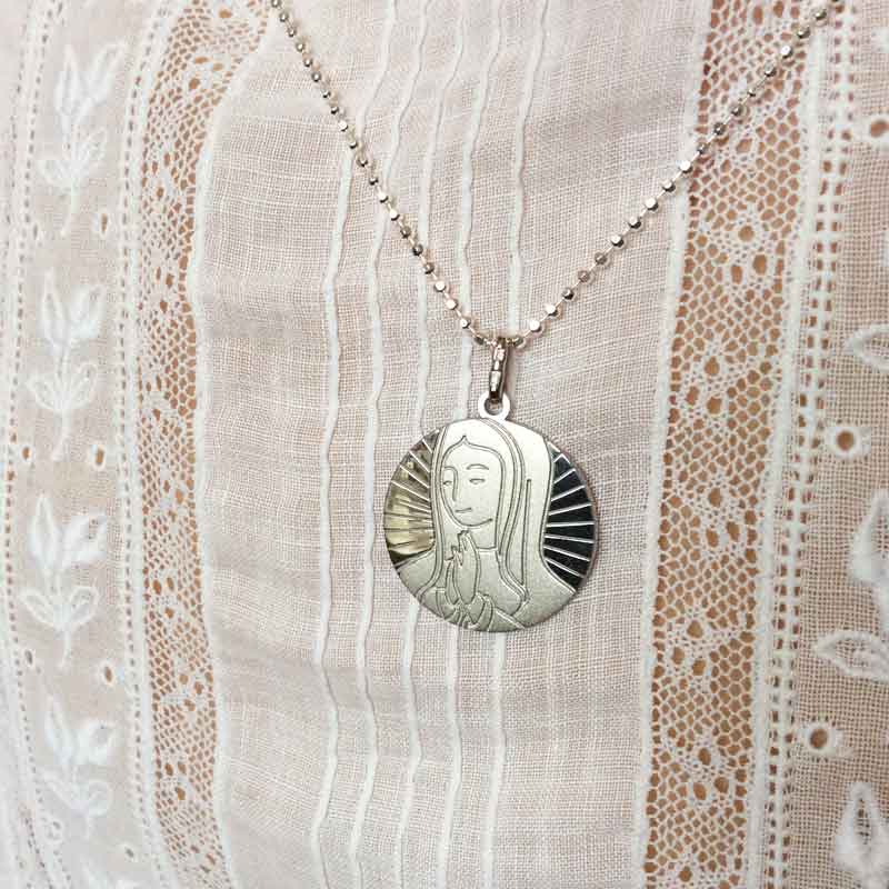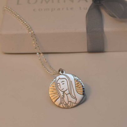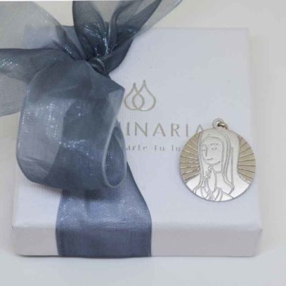 Medalla de plata de Ley, de 20mm con la imagen de la Virgen María rezando. De diseño propio de Luminaria, moderna, original y de calidad máxima.