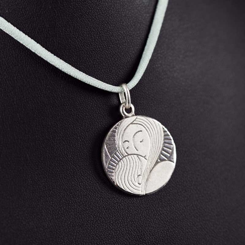 En esta Medalla de Plata de la Virgen María, nuestro dibujante representó a la María con el Niño muy moderna, llena de fuerza, transmitiendo ternura y amor. La Virgen nos hace sentirnos acogidos, tranquilos y con su sonrisa nos manda un mensaje de paz. Es la paz que ella misma siente cuando respira el suave aroma de la vida que su hijo le da. Cierra los ojos, el mundo desaparece, sólo existen Niño y felicidad.