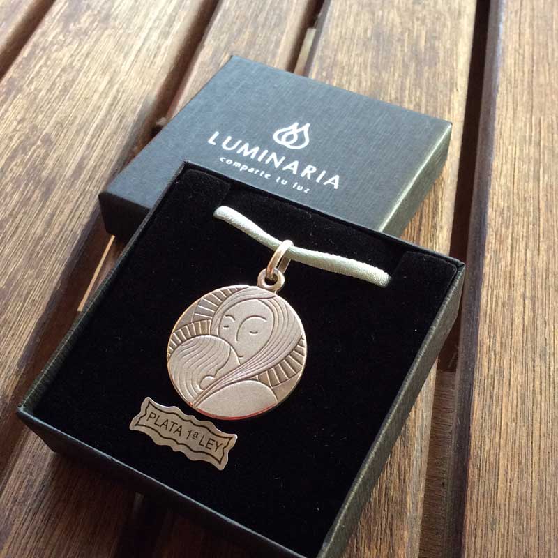 En esta Medalla de Plata de la Virgen María, nuestro dibujante representó a la María con el Niño muy moderna, llena de fuerza, transmitiendo ternura y amor. La Virgen nos hace sentirnos acogidos, tranquilos y con su sonrisa nos manda un mensaje de paz. Es la paz que ella misma siente cuando respira el suave aroma de la vida que su hijo le da. Cierra los ojos, el mundo desaparece, sólo existen Niño y felicidad.