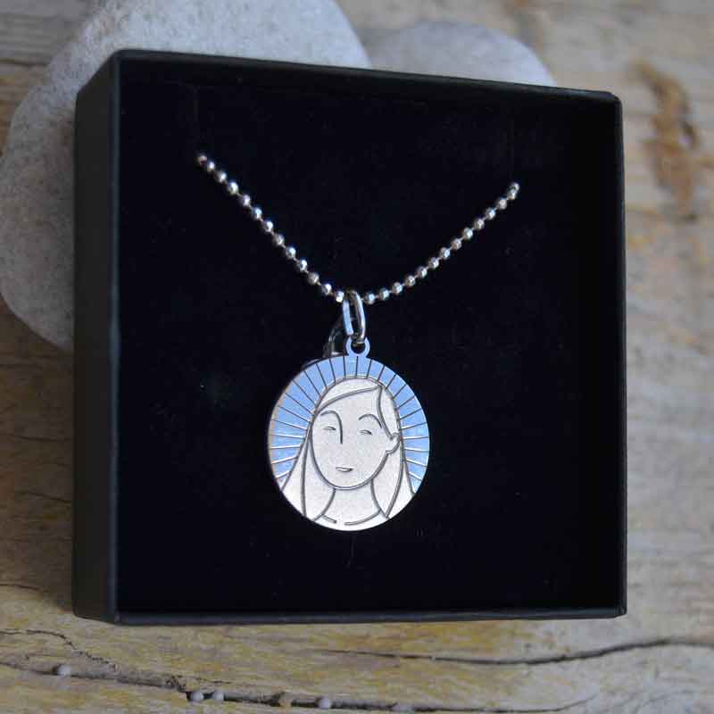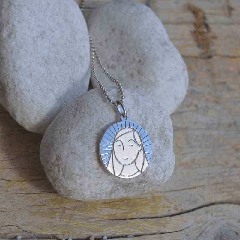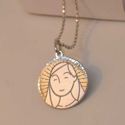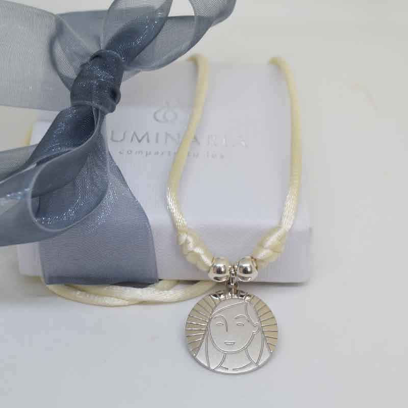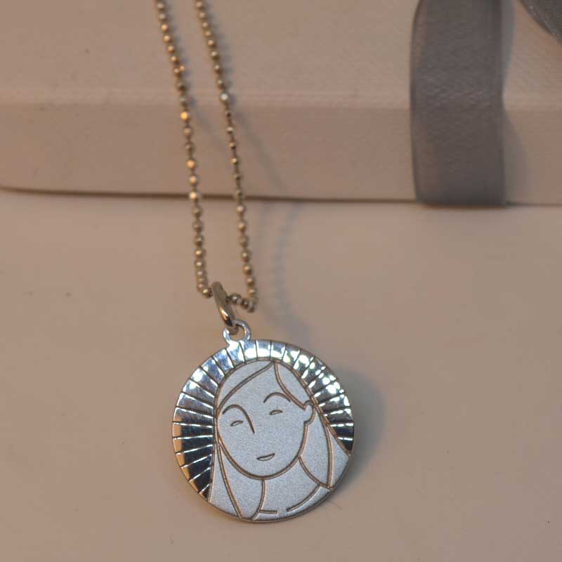 Medalla de plata de Ley, de 20mm con la imagen de la Virgen Niña Moderna. De diseño propio de Luminaria, moderna, original y de calidad máxima.