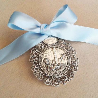 Un precioso Medallón Nacimiento de Plata, personalizable para poder grabarse el nombre del niño recien nacido y entregar un bonito regalo, que perdurará en el tiempo como un bonito recuerdo.