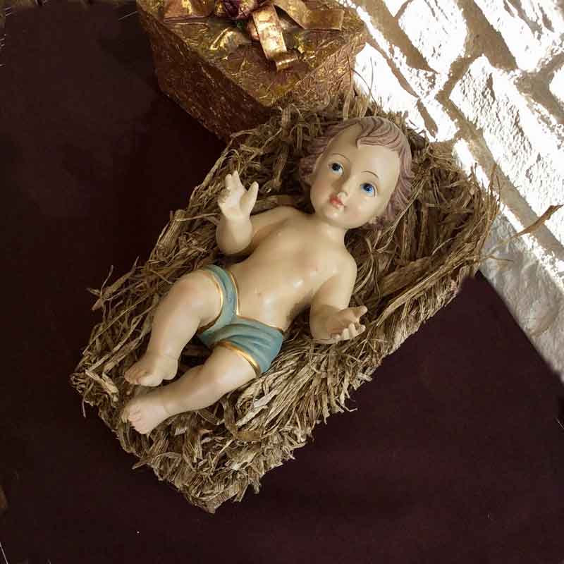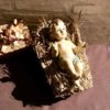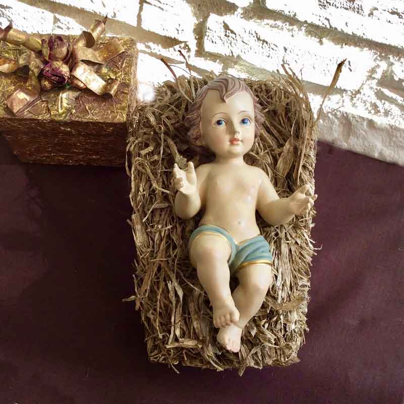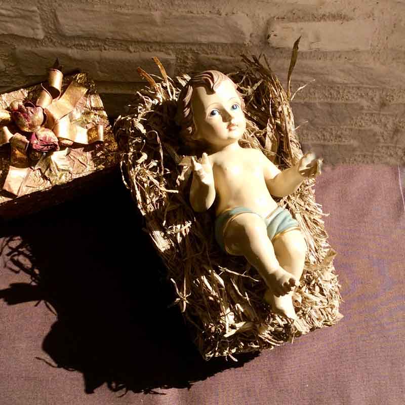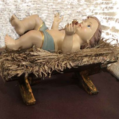 Niño Jesús artesano de 20 cms de medida, tumbado sobre pesebre de madera y paja natural de 24 cms de largo x 12 cms de ancho.