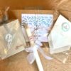 - Caja Kraft de regalo de Pack de Bautizo con etiqueta personalizada en color con el nombre del Niño/Niña impreso. Ideal para una bonita presentación.