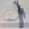 - Moderna Pulsera de Perlas de Comunión con cruz de plata maciza, de ley, montada sobre Perlas cultivadas de 6mm y ajustable al tamaño infantil con goma segura elástica. Se entrega en estuche especial de joyería de regalo, y es ideal para llevar a diario o en días especiales.