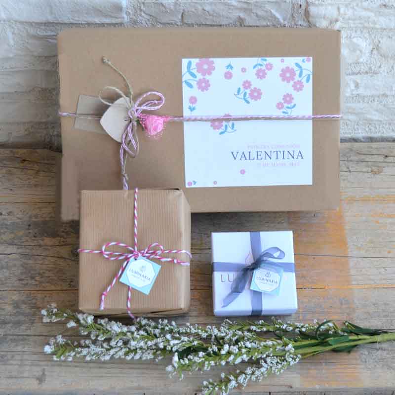 Moderno Pack comunión Niña, personalizable con una caja especial kraft, con una etiqueta de Primera de Primera Comunión con el nombre de la Niña, especial para poder guardar sus regalitos de este día importante.
