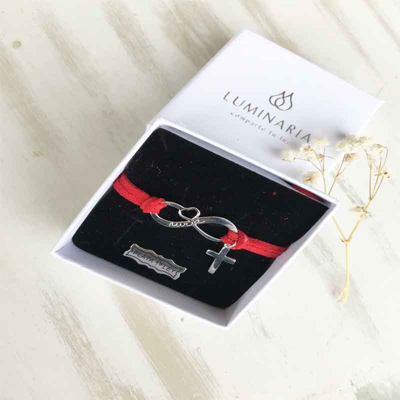 - Una Pulsera Infinito Grabada con su nombre, con cruz de plata, montada sobre antelinas rosas, y con cierre de plata ajustable también.
