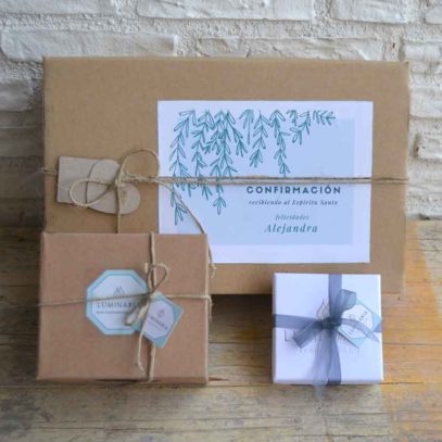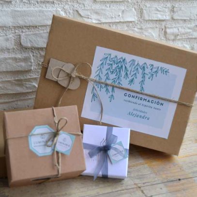Lleva una Caja de Kraft con una etiqueta personalizada, dedicada a la Confirmación y felicitándola por el momento especial.