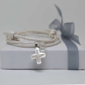 - Pulsera Cruz de plata de Ley, montada sobre cuero azul marino ( o marrón si no tuviéramos) y ajustable a la muñeca con nudos correderos. También podemos grabarla si el nombre del niño no es muy largo.