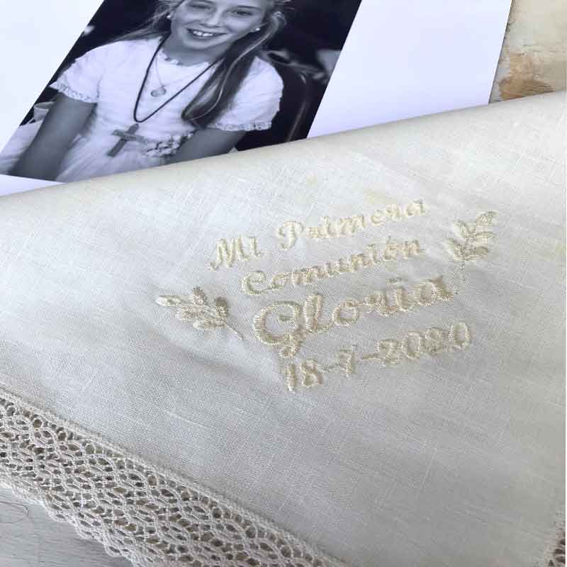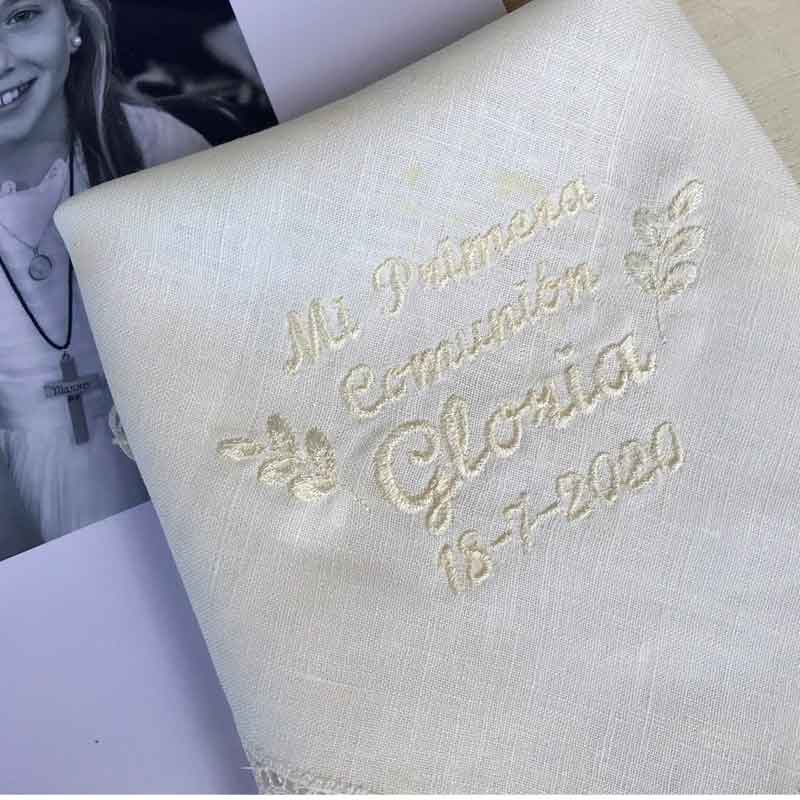 - Bordado completo con Nombre, Fecha, «Mi Primera Comunión» y dos ramitas de hojas. Nuestro pañuelo estrella y más regalado a todas las niñas.Es el complemento perfecto para el conjunto de la Primera Comunión.
