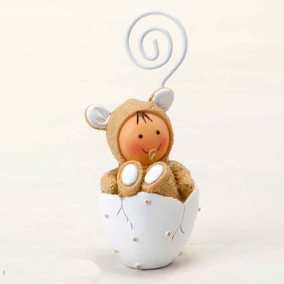 La figurita del bebé va vestido con pijamita de osito dentro de una cáscara de huevo. Medida 9 cms.